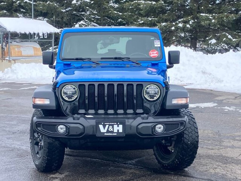 CARFAX One-Owner. Hydro Blue Pearl Coat 2022 Jeep Wrangler Unlimited Willys 4WD 8-Speed Automatic 2.0L I4 DOHC 2-Door Passive Entry, Front Door Locks, 4-Wheel Drive Swing Gate Decal, 97 MPH Vehicle Max Speed Calibration, Air Conditioning w/Auto Temperature Control, Air Filtering, Anti-Spin Differential Rear Axle, Automatic Headlamps, Black Grille, Black Trail Rated Badge, Blind Spot & Cross Path Detection, Cluster 7.0" TFT Color Display, Cold Weather Group, Convenience Group, Deep Tint Sunscreen Windows, Front 1-Touch Down Power Windows, Front LED Fog Lamps, Heated Front Seats, Heated Steering Wheel, Injection Molded Black Rear Bumper, Leather Wrapped Steering Wheel, LED Headlamp & Fog Lamp Group, LED Premium Reflector Headlamps, LED Taillamps, Matte Black Jeep Badge, Mold In Color Bumper w/Gloss Black, MOPAR All-Weather Floor Mats, ParkSense Rear Park Assist System, Power Heated Mirrors, Quick Order Package 22W Willys, Remote Keyless Entry, Safety Group, Security Alarm, SiriusXM Radio Service, SiriusXM Satellite Radio, Speed Sensitive Power Locks, Sun Visors w/Illuminated Vanity Mirrors, Technology Group, Universal Garage Door Opener, Wheels: 17" x 7.5" Moab Black Aluminum, Willys, Willys Hood Decal.